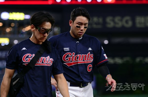 6일 인천 SSG 랜더스필드에서 ‘2022 신한은행 SOL KBO리그’ SSG 랜더스와 롯데 자이언츠의 경기가 열렸다. 6회말 무사 1, 2루에서 롯데 전준우가 무더위에 어지러움을 호소한 뒤 교체되고 있다.