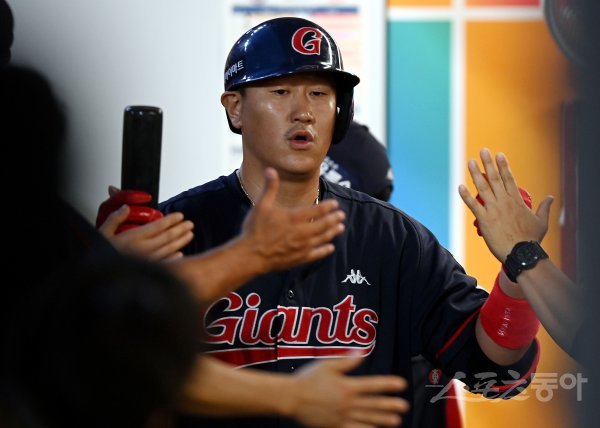 6일 인천 SSG 랜더스필드에서 ‘2022 신한은행 SOL KBO리그’ SSG 랜더스와 롯데 자이언츠의 경기가 열렸다. 6회초 2사 1루에서 롯데 이대호가 투런 홈런을 쏘아 올린 후 동료의 환영을 받고 있다.