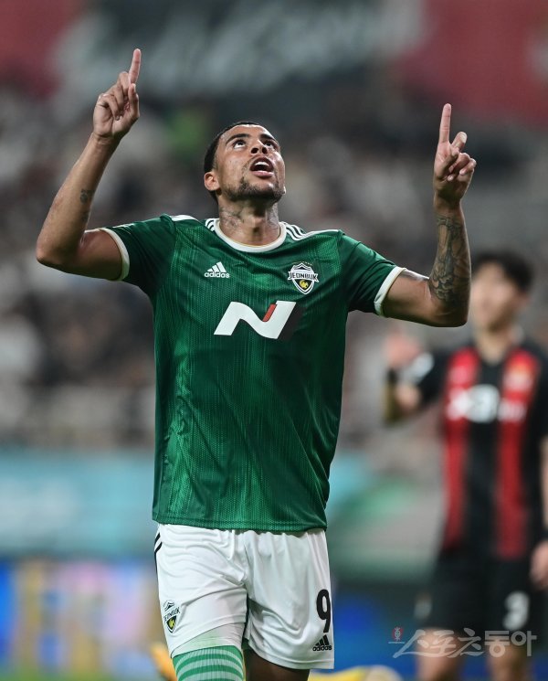 6일 서울월드컵경기장에서 열린 ‘하나원큐 K리그1 2022’ FC 서울과 전북 현대의 경기에서 전북 구스타보가 선제골을 성공시킨 후 세리머니를 하고 있다.