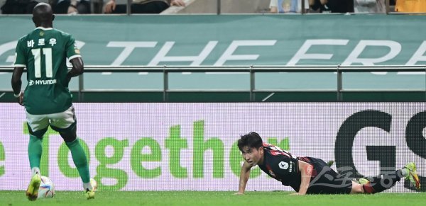 6일 서울월드컵경기장에서 열린 ‘하나원큐 K리그1 2022’ FC 서울과 전북 현대의 경기에서 서울 윤종규가 패스를 받는 과정에서 넘어지고 있다. 이 실수로 전북은 선제골을 기록했다.