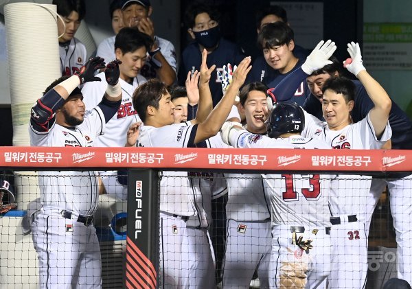 6일 서울 잠실야구장에서 ‘2022 신한은행 MY CAR KBO리그’ 키움 히어로즈와 두산 베어스 경기가 열렸다. 7회말 1사 만루 두산 허경민이 역전 좌월 만루 홈런을 날리고 그라운드를 돌아 홈인해 동료들의 축하를 받고 있다.