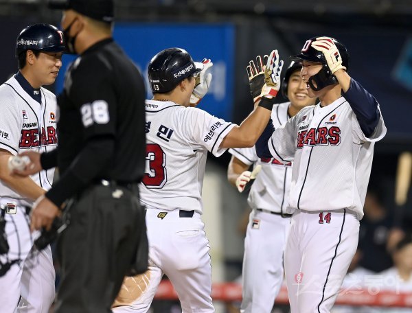 6일 서울 잠실야구장에서 ‘2022 신한은행 MY CAR KBO리그’ 키움 히어로즈와 두산 베어스 경기가 열렸다. 7회말 1사 만루 두산 허경민이 역전 좌월 만루 홈런을 날리고 그라운드를 돌아 홈인해 박계범의 축하를 받고 있다.