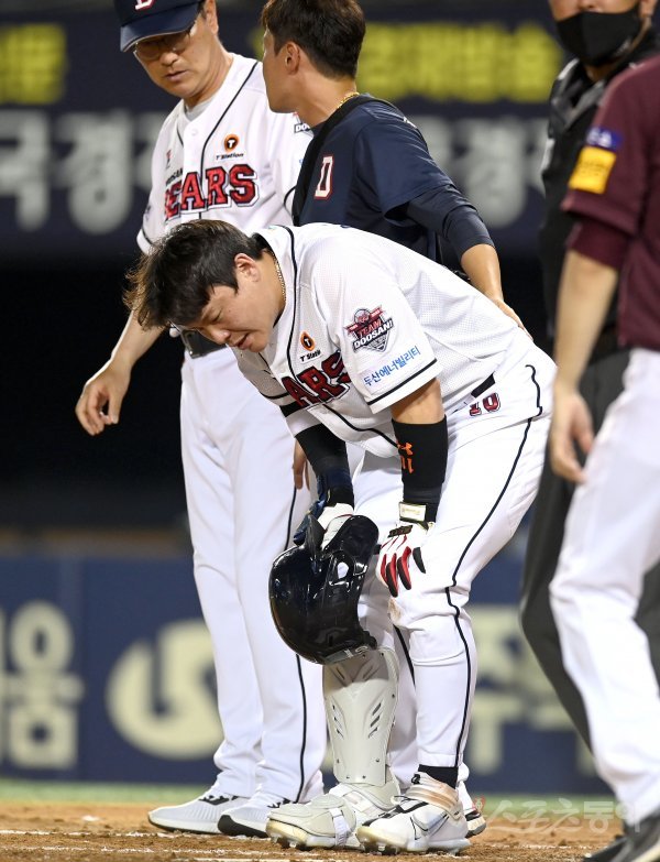 6일 서울 잠실야구장에서 ‘2022 신한은행 MY CAR KBO리그’ 키움 히어로즈와 두산 베어스 경기가 열렸다. 7회말 1사 2,3루 두산 박세혁이 사구를 맞아 고통스러워하고 있다.