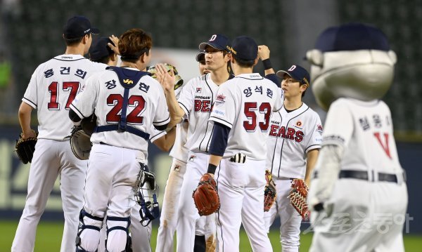6일 서울 잠실야구장에서 ‘2022 신한은행 MY CAR KBO리그’ 키움 히어로즈와 두산 베어스 경기가 열렸다. 5-2 역전승을 거두며 5연패에서 탈출한 두산 선수들이 하이파이브 하고 있다.