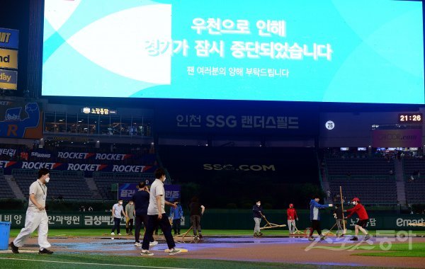 6일 인천 SSG 랜더스필드에서 ‘2022 신한은행 SOL KBO리그’ SSG 랜더스와 롯데 자이언츠의 경기가 열렸다. 8회초 갑작스런 폭우로 인해 경기가 잠시 중단 후 비가 그치자 야구장 관계자들이 그라운드에 고인 물을 제거하고 있다.
