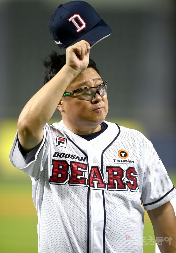 6일 서울 잠실야구장에서 ‘2022 신한은행 MY CAR KBO리그’ 키움 히어로즈와 두산 베어스 경기가 열렸다. 5-2 역전승을 거두며 5연패에서 탈출한 두산 김태형 감독이 팬들에게 인사하고 있다.