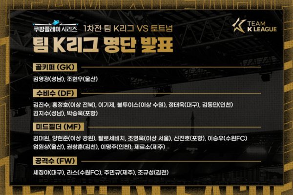 한국프로축구연맹은 오는 13일 서울월드컵경기장에서 열리는 '쿠팡플레이 시리즈' 1차전 토트넘과의 경기에 나서는 팀 K리그 선수 명단을 7일 발표했다.
