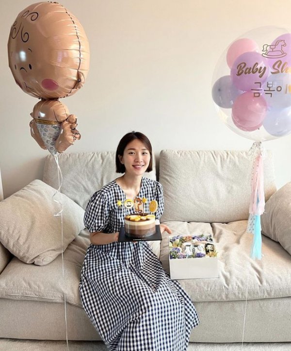 함께 공개한 사진 속 박승희는 편안한 분위기에서 받은 선물과 축하 케이크를 들고 포즈를 취하고 있다. 태명인 \'금복이\'라고 적힌 풍선이 보는 이들을 미소짓게 한다.