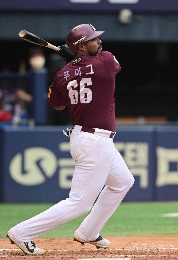 7일 서울 잠실야구장에서 열린 ‘2022 신한은행 SOL KBO리그’ 두산 베어스와 키움 히어로즈의 경기에서 1회초 1사 1, 2루 키움 푸이그가 선제 1타점 우전 적시타를 치고 있다.