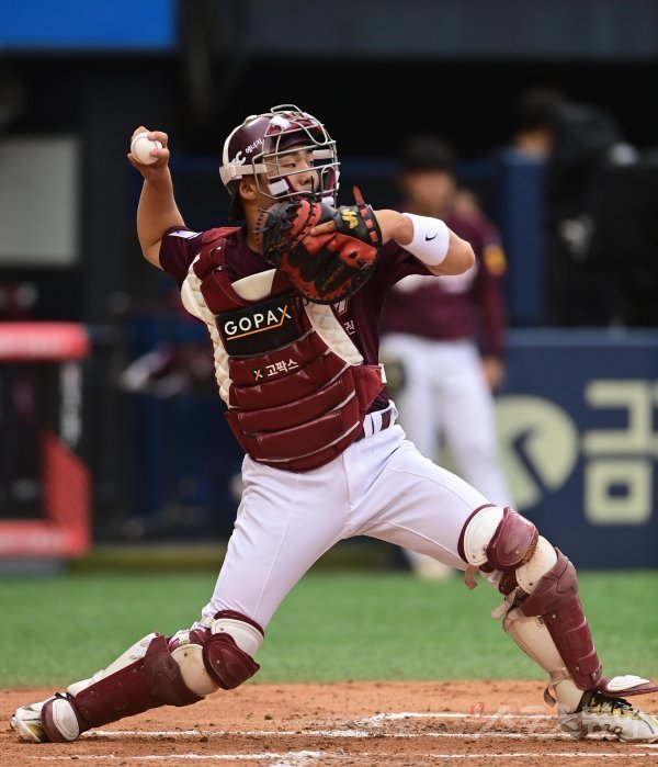 7일 서울 잠실야구장에서 열린 ‘2022 신한은행 SOL KBO리그’ 두산 베어스와 키움 히어로즈의 경기에서 KBO 데뷔 첫 선발 출장한 키움 김시앙이 2루로 송구 연습을 하고 있다.