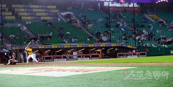 7일 인천 SSG 랜더스필드에서 ‘2022 신한은행 SOL KBO리그’ SSG 랜더스와 롯데 자이언츠의 경기가 열렸다. 비가 내리는 가운데 야구팬들이 우산을 쓴채 경기를 지켜보고 있다.
