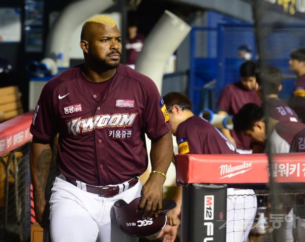 7일 서울 잠실야구장에서 열린 ‘2022 신한은행 SOL KBO리그’ 두산 베어스와 키움 히어로즈의 경기에서 두산에 2-4로 패한 키움 푸이그가 더그아웃에서 장비를 챙기고 있다.
