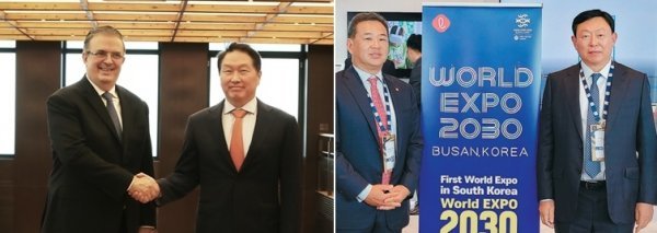 부산엑스포 유치 민간위원장을 맡고 있는 최태원 SK그룹 회장은 6일 서울 종로구 SK서린빌딩에서 마르셀로 에브라르드 멕시코 외무장관을 만나 한국 정부와 민간기업들이 원팀이 돼 유치활동을 벌이고 있는 ‘2030 부산엑스포’의 주제와 의제가 멕시코 발전에 기여할 수 있다는 점을 강조하며 유치 지원을 적극적으로 당부했다.