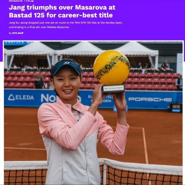 장수정(27·대구시청)은 10일(한국시간) 스웨덴 베스타드에서 열린 노디아오픈 대회 마지막 날 단식 결승에서 리베카 마사로바(스페인·146위)에 세트스코어 2-1(3-6 6-3 6-1) 역전승을 거뒀다.