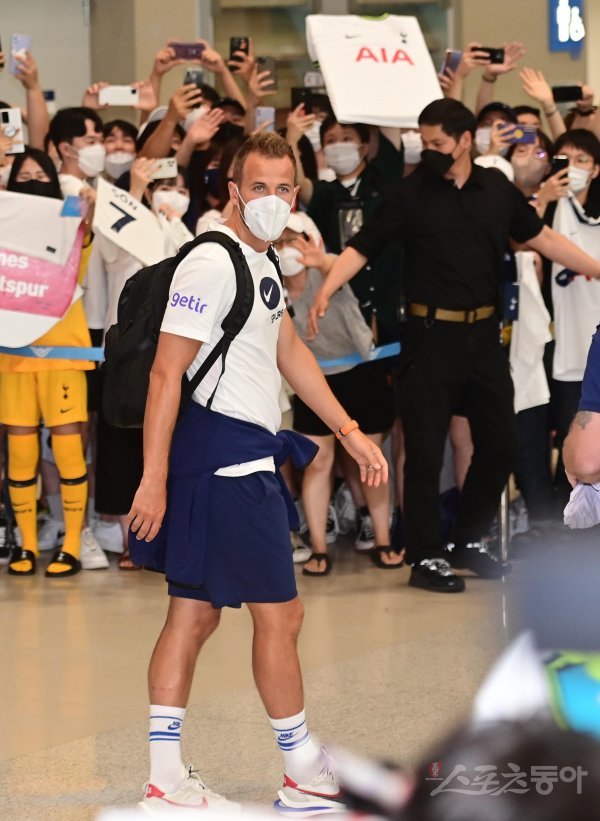 토트넘 홋스퍼 FC 해리 케인이 프리시즌 방한 경기를 위해 10일 인천국제공항 2터미널을 통해 입국한 후 팬들을 바라보고 있다.