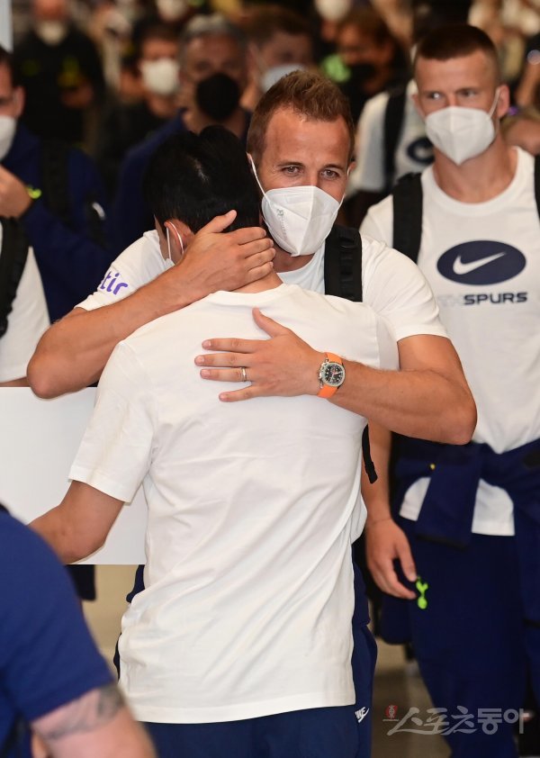 토트넘 홋스퍼 FC 해리 케인이 프리시즌 방한 경기를 위해 10일 인천국제공항 2터미널을 통해 입국한 후 손흥민과 포옹하고 있다.