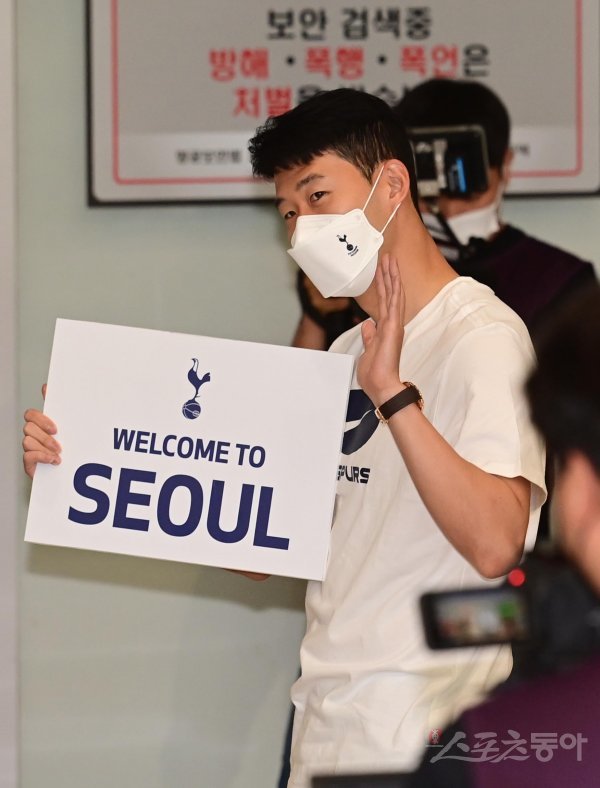 토트넘 홋스퍼 FC 손흥민이 프리시즌 방한 경기를 위해 10일 인천국제공항 2터미널을 통해 입국하는 동료들을 위해 마중 인사를 하고 있다.