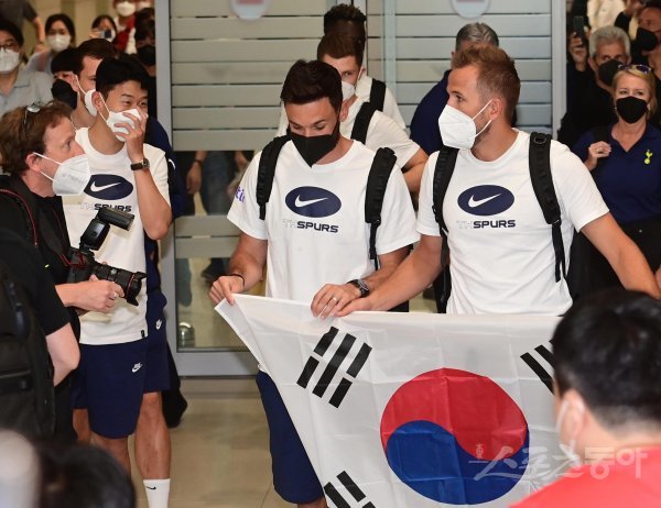 토트넘 홋스퍼 FC 위고 요리스, 해리 케인이 프리시즌 방한 경기를 위해 10일 인천국제공항 2터미널을 통해 입국한 후 태극기를 들고 손흥민과 기념 촬영을 준비하고 있다.