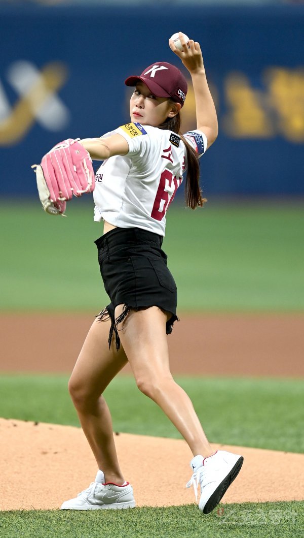 10일 서울 고척스카이돔에서 ‘2022 신한은행 MY CAR KBO리그’ NC 다이노스와 키움 히어로즈가 경기가 열렸다. 경기 전 가수 소유가 시구를 하고 있다.