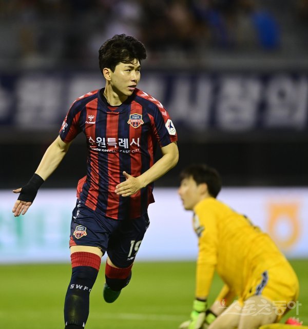 10일 경기도 수원종합운동장에서 열린 ‘하나원큐 K리그1 2022’ 수원 FC와 FC 서울의 경기에서 수원 FC 김승준이 역전골을 성공시킨 후 세리머니를 하고 있다.