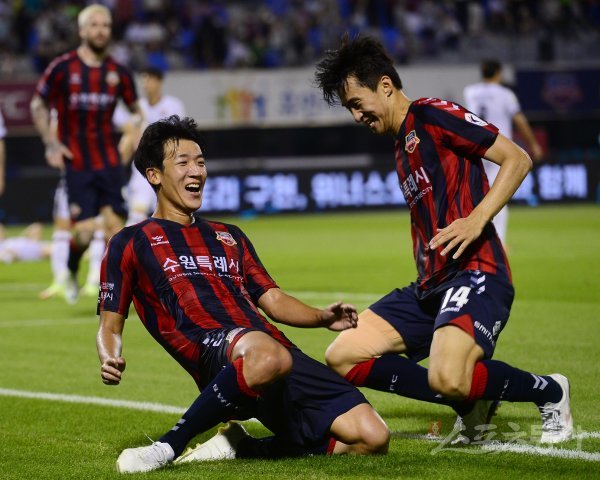 10일 경기도 수원종합운동장에서 열린 ‘하나원큐 K리그1 2022’ 수원 FC와 FC 서울의 경기에서 수원 FC 정재용(왼쪽)이 팀내 네 번째 골을 성공시킨 후 세리머니를 하고 있다.