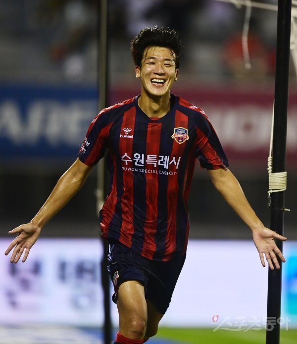 10일 경기도 수원종합운동장에서 열린 ‘하나원큐 K리그1 2022’ 수원 FC와 FC 서울의 경기에서 수원 FC 정재용이 팀내 네 번째 골을 성공시킨 후 세리머니를 하고 있다.