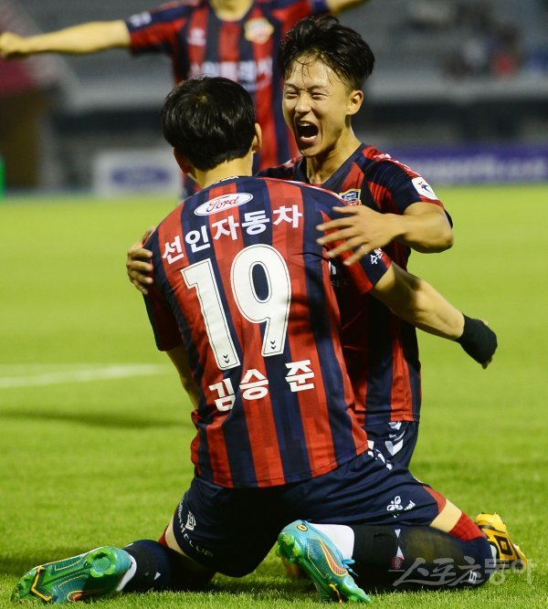 10일 경기도 수원종합운동장에서 열린 ‘하나원큐 K리그1 2022’ 수원 FC와 FC 서울의 경기에서 수원 FC 김승준이 역전골을 성공시킨 후 이승우와 기쁨을 나누고 있다. 수원 | 주현희 기자 teth1147@donga.com
