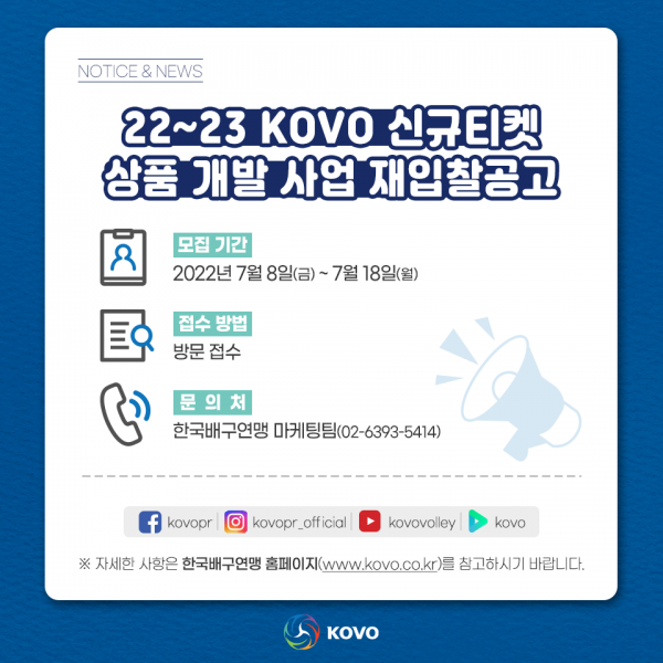 KOVO는 문화체육관광부와 국민체육진흥공단이 지원하는 2022-23시즌 KOVO 신규티켓 상품 개발 사업을 대행할 업체를 재 모집한다고 11일 전했다.