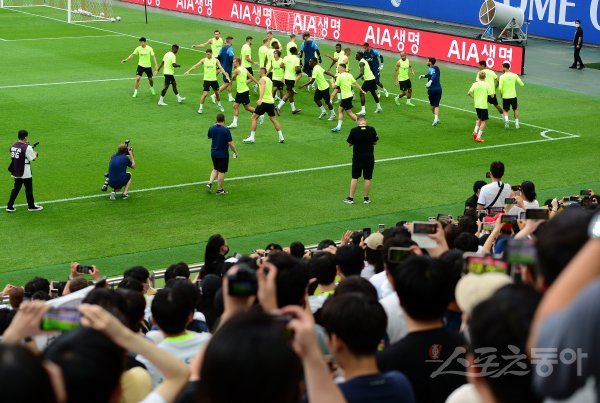 손흥민의 소속팀 토트넘이 11일 서울월드컵경기장에서 오픈 트레이닝을 가졌다. 토트넘 선수들이 몸을 풀자 축구팬들이 지켜보고 있다.