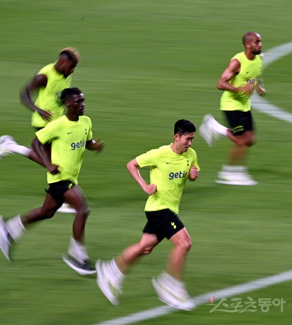손흥민의 소속팀 토트넘이 11일 서울월드컵경기장에서 오픈 트레이닝을 가졌다. 토트넘 손흥민이 동료들과 훈련을 마친 후 그라운드를 달리고 있다.