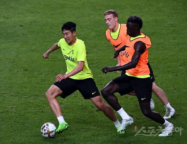 손흥민의 소속팀 토트넘이 11일 서울월드컵경기장에서 오픈 트레이닝을 가졌다. 토트넘 손흥민이 동료들의 수비를 제치며 돌파하고 있다.