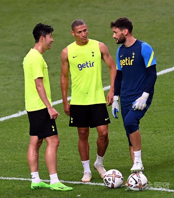 손흥민의 소속팀 토트넘이 11일 서울월드컵경기장에서 오픈 트레이닝을 가졌다. 토트넘 손흥민이 히샬리송, 요리스와 이야기를 나누고 있다.