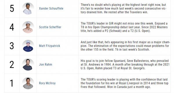 1위는 로리 매킬로이(아일랜드)다. PGA 투어는 매킬로이에 대해 “2014년 로열 리버풀에서 열린 디오픈에서 우승했고 이후 3차례 5위 안에 들었다”며 “불과 한 달 전 캐나다오픈에서 정상에 섰다”고 우승 1순위로 꼽은 이유를 설명했다.