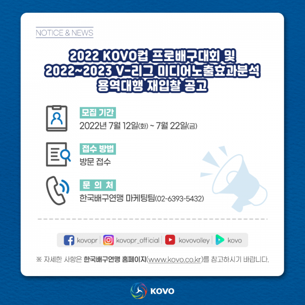 KOVO는 12일 문화체육관광부와 국민체육진흥공단이 지원하는 2022-23시즌 프로배구 미디어 노출 효과 분석 용역대행 업체를 재 모집한다고 전했다.