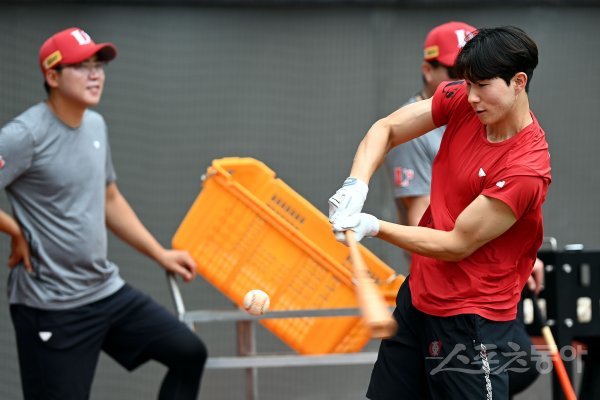 12일 인천 SSG 랜더스필드에서 ‘2022 신한은행 SOL KBO리그’ SSG 랜더스와 키움 히어로즈의 경기가 열린다. 경기 전 SSG 박성한이 훈련을 펼치고 있다.