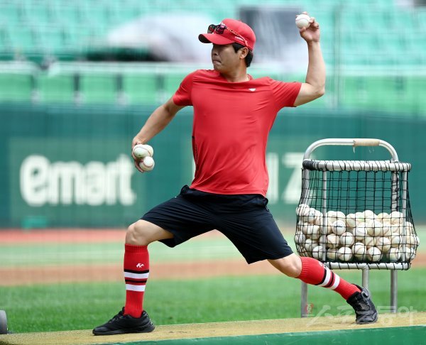 12일 인천 SSG 랜더스필드에서 ‘2022 신한은행 SOL KBO리그’ SSG 랜더스와 키움 히어로즈의 경기가 열린다. 경기 전 SSG 조동화 코치가 배팅볼을 던지고 있다.