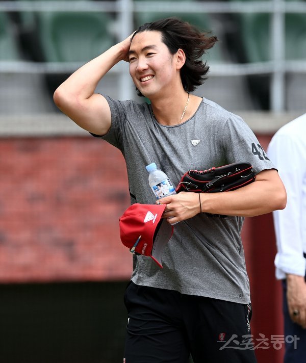 12일 인천 SSG 랜더스필드에서 ‘2022 신한은행 SOL KBO리그’ SSG 랜더스와 키움 히어로즈의 경기가 열린다. 경기 전 부상에서 복귀한 SSG 문승원이 긴 머리를 휘날리며 더그아웃으로 향하고 있다.