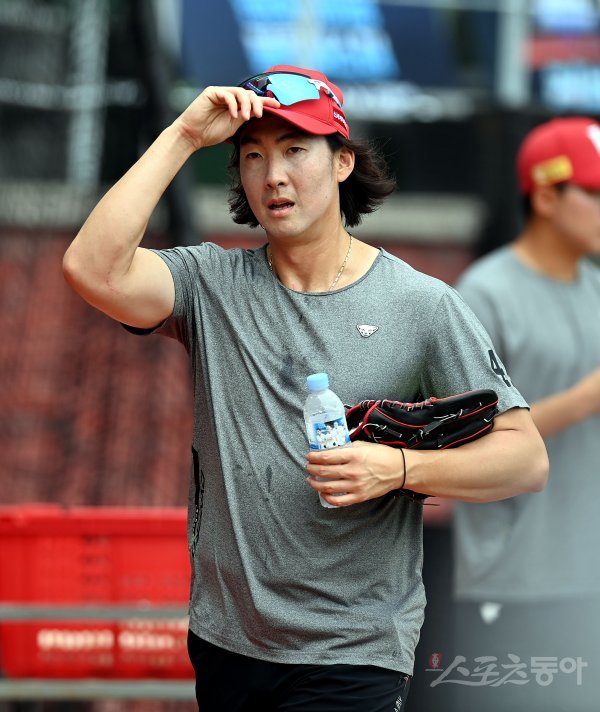 12일 인천 SSG 랜더스필드에서 ‘2022 신한은행 SOL KBO리그’ SSG 랜더스와 키움 히어로즈의 경기가 열린다. 경기 전 부상에서 복귀한 SSG 문승원이 긴 머리를 휘날리며 더그아웃으로 향하고 있다.