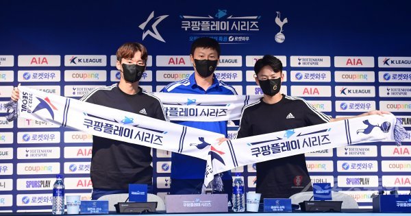 팀 K리그 김진수, 김상식 감독, 이승우가 12일 서울월드컵경기장에서 열린 쿠팡플레이 시리즈 ‘팀 K리그-토트넘’ 프리매치 기자회견에서 포즈를 취하고 있다.