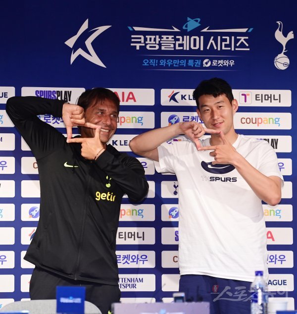 토트넘 안토니오 콘테 감독과 손흥민이 12일 서울월드컵경기장에서 열린 쿠팡플레이 시리즈 ‘팀 K리그-토트넘’ 프리매치 기자회견에서 포즈를 취하고 있다.