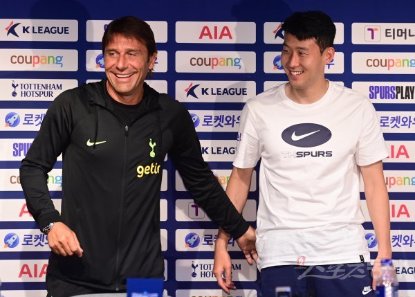 토트넘 안토니오 콘테 감독과 손흥민이 12일 서울월드컵경기장에서 열린 쿠팡플레이 시리즈 ‘팀 K리그-토트넘’ 프리매치 기자회견에서 포즈를 취하고 있다.