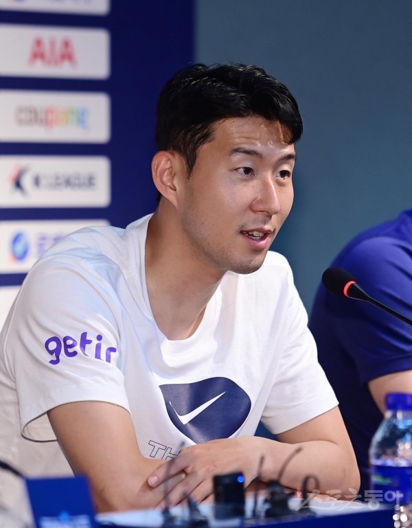 토트넘 손흥민이 12일 서울월드컵경기장에서 열린 쿠팡플레이 시리즈 ‘팀 K리그-토트넘’ 프리매치 기자회견에서 취재진의 질문에 답하고 있다.