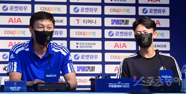 팀 K리그 김상식 감독이 12일 서울월드컵경기장에서 열린 쿠팡플레이 시리즈 ‘팀 K리그-토트넘’ 프리매치 기자회견에서 취재진의 질문에 답하고 있다.