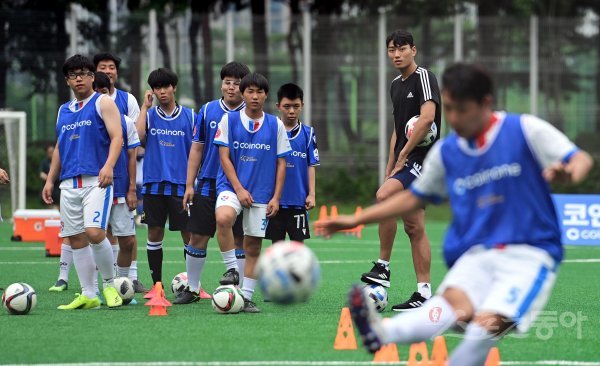 팀 K리그 정태욱이 12일 서울월드컵경기장 보조경기장에서 열린 스페셜올림픽코리아 K리그 통합축구팀 축구 클리닉에서 참가 선수들의 슈팅을 지켜보고 있다. 상암 | 주현희 기자 teth1147@donga.com