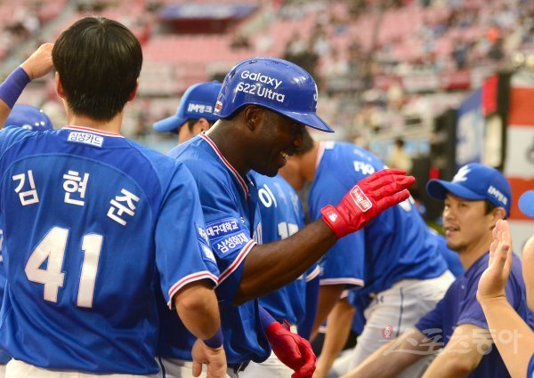 12일 수원KT위즈파크에서 ‘2022 신한은행 MY CAR KBO리그’ 삼성 라이온즈와 KT 위즈 경기가 열렸다. 3회초 1사 1루 삼성 피렐라가 선제 좌월 투런 홈런을 날리고 홈인해 하이파이브 하고 있다.