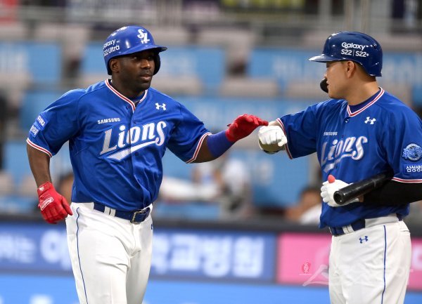 12일 수원KT위즈파크에서 ‘2022 신한은행 MY CAR KBO리그’ 삼성 라이온즈와 KT 위즈 경기가 열렸다. 3회초 1사 1루 삼성 피렐라가 선제 좌월 투런 홈런을 날리고 홈인해 하이파이브 하고 있다.