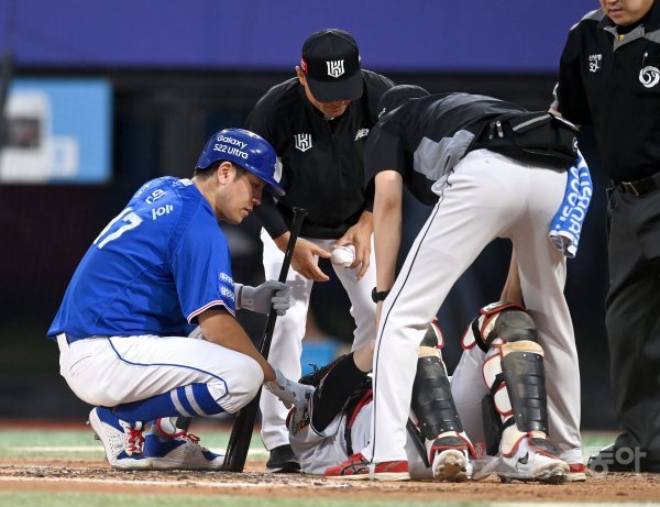 12일 수원KT위즈파크에서 ‘2022 신한은행 MY CAR KBO리그’ 삼성 라이온즈와 KT 위즈 경기가 열렸다. 2회초 1사 2루 KT 김준태가 파울 타구를 맞고 쓸어지자 삼성 강민호가 상태를 살피고 있다.