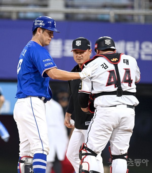 12일 수원KT위즈파크에서 ‘2022 신한은행 MY CAR KBO리그’ 삼성 라이온즈와 KT 위즈 경기가 열렸다. 2회초 1사 2루 삼성 강민호가 파울 타구를 맞고 쓸어졌던 KT 김준태의 유니폼 흙을 털어주고 있다.
