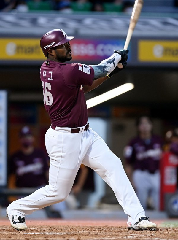 12일 인천 SSG 랜더스필드에서 ‘2022 신한은행 SOL KBO리그’ SSG 랜더스와 키움 히어로즈의 경기가 열렸다. 5회초 1사에서 키움 푸이그가 동점 솔로 홈런을 쏘아 올리고 있다.