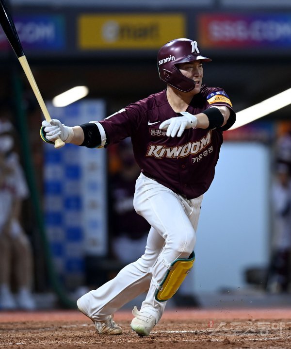 12일 인천 SSG 랜더스필드에서 ‘2022 신한은행 SOL KBO리그’ SSG 랜더스와 키움 히어로즈의 경기가 열렸다. 5회초 2사 만루에서 키움 김준완이 1타점 적시타를 날리고 있다.